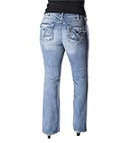 Silver Jeans: Silver Pioneer Jeans Womens Denim Plus Size Jeans. The Pioneer Bootcut Jeans is Silver's Red Label Fit which offers a slim thigh that is cut straight through the waist and hip yet still contours to your waist. Features: Zip Fly. Bootcut leg, Lowrise, flap back pockets and vintage distressed look. Medium Wash made in supreme soft hand stretch denim with high concentration pure liquid indigo Slim Fit. 91% cotton 9% polyester.